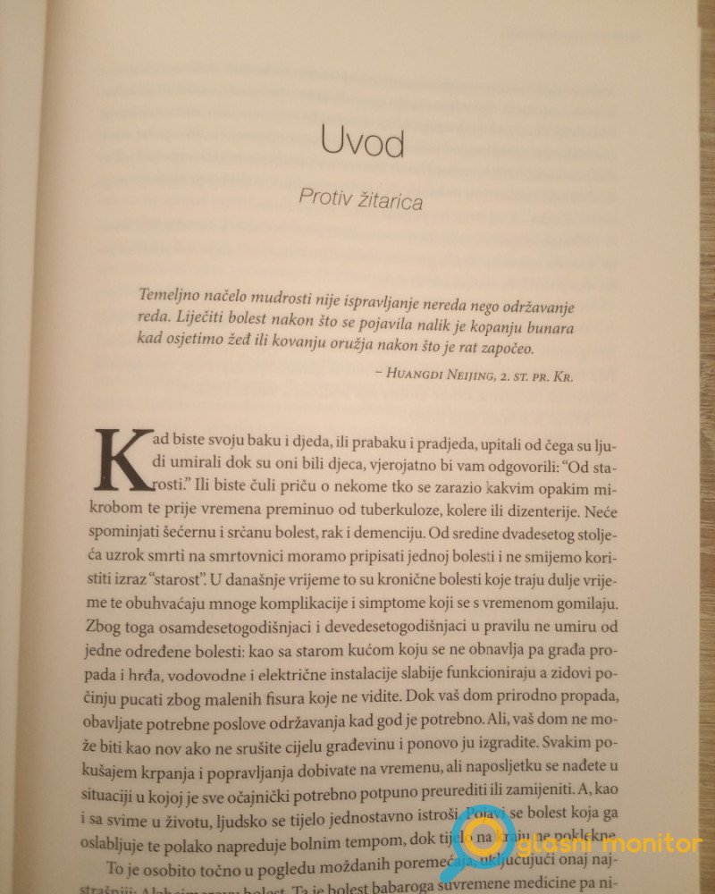 K. ad biste svoju baku i djeda, ili prabaku ipradjeda, upitali od čega su lju-di umirali dok su oni bili djeca, vjerojatno bi vam odgovorili: "Od sta-osti:' Ili biste čuli priču o nekome tko se zarazio kakvim opakim mi-krobom te prije vremena preminuo od tuberkuloze, kolere ili dizenterije. Neće spominjati šećernu i srčanu bolest, rak i demenciju. Od sredine dvadesetog stolje-ća uzrok smrti na smrtovnici moramo pripisati jednoj bolesti i ne smijemo kori-stiti izraz "starost". U današnje vrijeme to su kronične bolesti koje traju dulje vrije-me te obuhvaćaju mnoge komplikacije i simptome koji se s vremenom gomilaju. Zbog toga osamdesetogodišnjaci i devedesetogodišnjaci u pravilu ne umiru od jedne odreclene bolesti: kao sa starom kućom koju se ne obnavlja pa građa pro-pada i hrđa, vodovodne i električne instalacije slabije funkcioniraju a zidovi po-činjupucati zbog malenih fisura koje ne vidite. Dok vaš dom prirodno propada, obavljate potrebne poslove održavanja kad god je potrebno. Ali, vaš dom ne mo-že biti kao nov ako ne srušite cijelu gradevinu i ponovo ju izgradite. Svakim po-kušajem krpanja i popravljanja dobivate na vremenu, ali naposljetku se nađete u situaciji u kojoj je sve očajnički potrebno potpuno preurediti ili. zamijeniti. A, kao i sa svime u životu, ljudsko se tijelo jednostavno istroši. Pojavi se bolest koja ga oslabljuje te polako napreduje bolnim tempom, dok tijelo na kraju ne poklekne. To je osobito točno u pogledu moždanih poremećaja, uključujući onaj naj-traniii: Alzheimerovu bolest. Ta je bolest babaroga suvremene medicine pa ni-