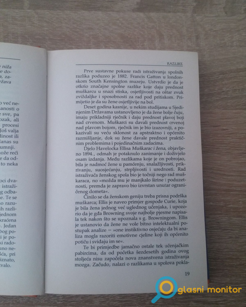 Temeljni podaci za ovu knjigu proizlaze iz istra živanja mnogih znanstvenika širom svijeta, a bez nji- hove znatiželje i traganja za istinom ova knjiga ne bi nikad mogla biti napisana. Posebno zahvalnost izra- žavamo pak onim istraživačima koji su strpljivo od- govarali na naše upite ifili nam poslali najnovije re- zultate iz svojih radova: dr. Camilla Benbow, dr. An ke Ehrhart, dr. Helen Fischer, dr.Robert Goy, dr. Ro- ger Gorski, prof.Lauren Julius Harris, dr. Mellisa Hi nes, profesor Doreen Kimura, dr. Jane Lancaster, dr. Jerre Levy, dr. Seymour Levine, dr. Catherine Mate- er, dr. Bruce McEwen, dr. Dianne McGuinnes, dr Jeanette McGlone, dr. Heino Meyer-Bahlburg, prof. Julian Stanley, dr. June Reinisch, dr. Richard Restak, dr. Alice Rossi, prof. Walter Stumpf, prof. Lionel Ti- ger, prof. David Taylor, dr. Sandra Witleson, dr. Glen Wilson. Pionir na području istraživanja razlika medu spolovima, dr. Corinne Hutt pomagala nam je ranije, ohrabrujući nas da nastavimo radom Na kraju knjige je i popis najvažnijih knjiga koje mogu poslužiti čitatelju za daljnje upoznavanje s te- mom. Klinički slučajevi opisani ovdje ne odnose se na pajedince već odražavaju opće značajke i uzorak veli- kog broja proučavanih slučajeva