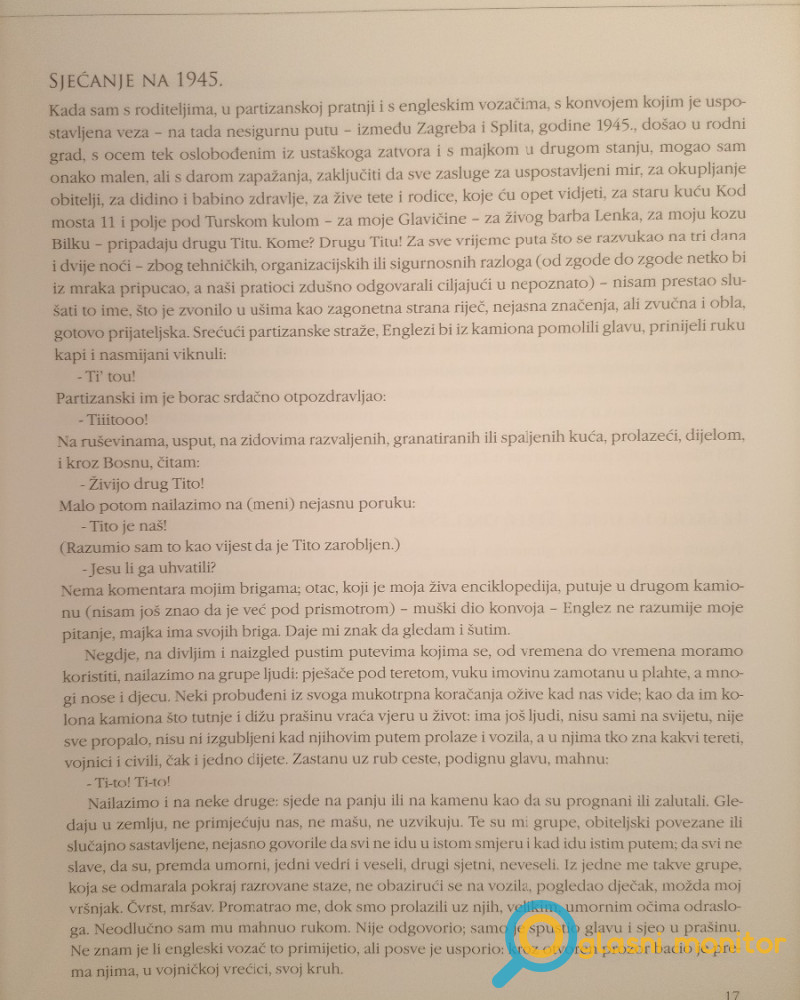 SJECANJE NA 1945. Kada sam s roditeljima, u partizanskoj pratnji i s engleskim vozačima, s konvojem kojim je uspo-stavljena veza - na tada nesigurnu putu - između Zagreba i Splita, godine 1945., došao u rodni grad. s ocem tek oslobodenim iz ustaškoga zatvora i s majkom u drugom stanju, mogao sam onako malen. ali s darom zapažanja. zaključiti da sve zasluge za uspostavljeni mir, za okupljanje obitelji, za didino i babino zdravlje, za žive tete i rodice, koje ću opet vidjeti, za staru kuću Kod mosta 11 i polje pod Turskom kulom - za moje Glavičine - za živog barba Lenka, za moju kozu Bilku pripadaju drugu Titu. Kome? Drugu Titu! Za sve vrijeme puta što se razvukao na tri dana i dvije noći - zbog tehničkih, organizacijskih sigurnosnih razloga (od zgode do zgode netko bi iz mraka pripucao. a naši pratioci zdušno odgovarali ciljajući u nepoznato) - nisam prestao slu-šati to ime, što je zvonilo u ušima kao zagonetna strana riječ, nejasna značenja, ali zvučna i obla, gotovo prijateljska. Srećuć1 partizanske straže, Englezi bi iz kamiona pomolili glavu, prinijeli ruku kapi i nasmijani viknull: - tou! Partizanski im je borac srdačno otpozdravljao: - Tiiit000! ruševinama, usput, na zidovima razvaljenih, granatiranih ili spaljenih kuća, prolazeći, dijelom, i kroz Bosnu, čitam: - Živijo drug Tito! Malo potom nailazimo na (meni) nejasnu poruku: - Tito je naš! (Razumio sam to kao vijest da je Tito zarobljen.) - Jesu li ga uhvatili? Nema komentara mojim brigama; otac, koji je moja živa enciklopedija, putuje u drugom kamio-nu (nisam još znao da je već pod prismotrom) - mušiki dio konvoja - Englez ne razumije moje pitanje, majka ima svojih briga. Daje mi znak da gledam i šutim. Negdje, na divljim i naizgled pustim putevima kojima se, od vremena do vremena moramo koristiti, nailazimo na grupe pješače pod teretom, vuku imovinu zamotanu u plahte, a mno-gi nose i djecu. Neki probuđeni iz svoga mukotrpna koračanja ožive kad nas vide; kao da im ko-lona kamiona što tutnje i dižu prašinu vraća vjeru u život: ima još ljudi, nisu sami na svijetu, nije sve propalo, nisu ni izgubljeni kad njihovim putem prolaze i vozila, a u njima tko zna kakvi tereti, vojnicj i civiii, čak i jedno dijete, Zastanu uz rub ceste, podignu glavu, mahnu: - Tj-to! Ti-to! NaiIazimo i na neke druge: sjede na panju ili na kamenu kao da su prognani ili zalutali. Gle-daju u zemlju, ne primjećuju nas, ne mašu, ne uzvikuju. Te su mi grupe, obiteljski povezane ili slučajno sastavijene, nejasno govorile da svi ne idu u istom smjeru i kad idu istim putem; da svi ne slave, da su, premda umorni, jedni vedri i veseli, drugi sjetni, neveseli. Iz jedne me tak-ve grupe, koja se odmarala pokraj razrovane staze, ne obazirući se na vozila, pogleciao dječak, možda moj vršnjak. Čvrst, mršav. Promatrao me, dok smo prolazili uz njih, velikim, umornim očima odraslo-ga. Neodlućno sam mu mahnuo rukom. Nije odgovorio; samo je spustio glavu i sjeo u prašinu. Ne znam je li engleski vozač to primijetio, ali posve je usporio: kroz otvoren prozor bacio je pre-ma njima, u vojničkoj vrećici, svoj kruh.
